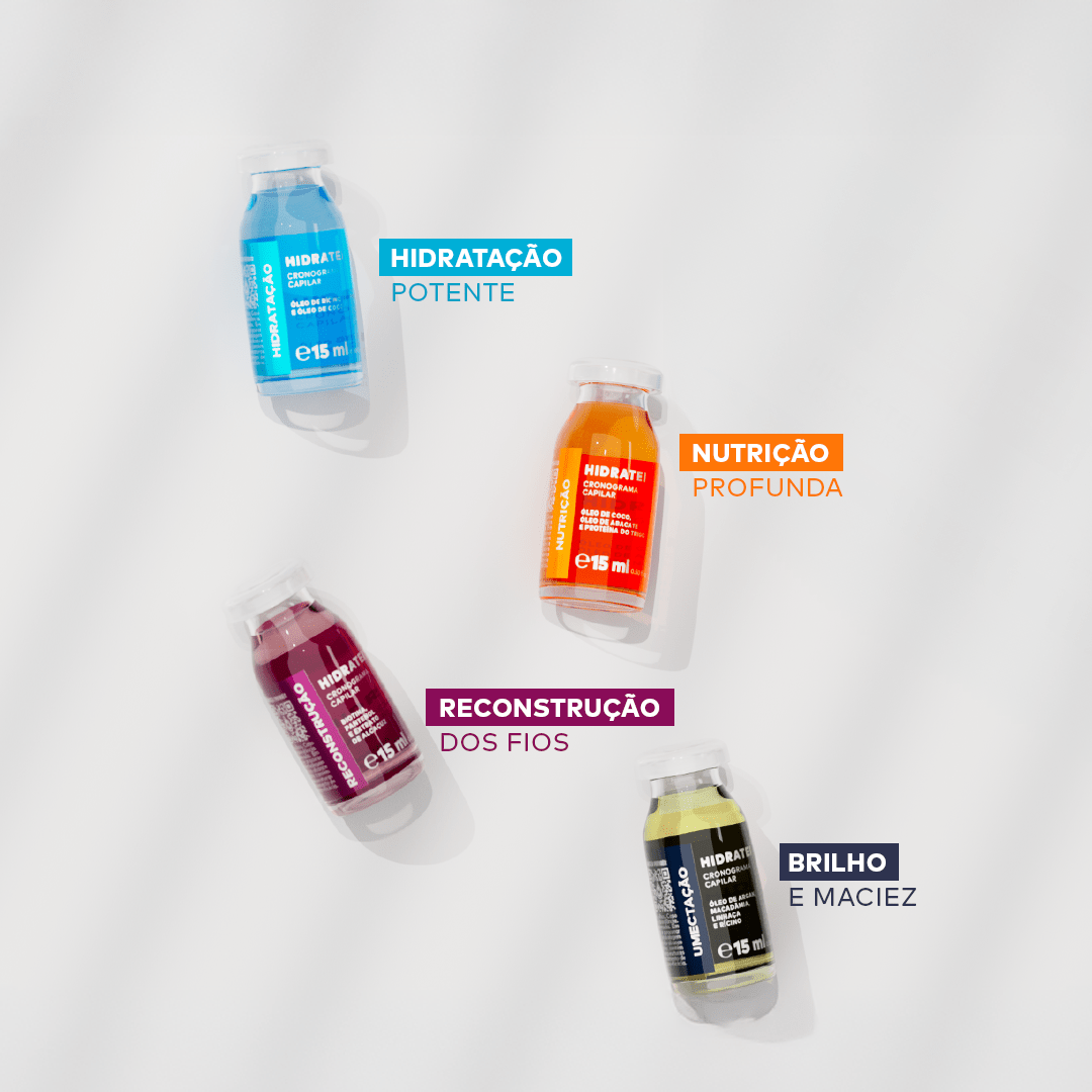 Recupere seus cabelos em apenas 4 semanas! O Cronograma Capilar Hidratei é um tratamento intensivo que hidrata, nutre, reconstrói e traz umectação aos fios, garantindo brilho, maciez e força. O herói que vai salvar seu cabelo dos danos semanalmente!