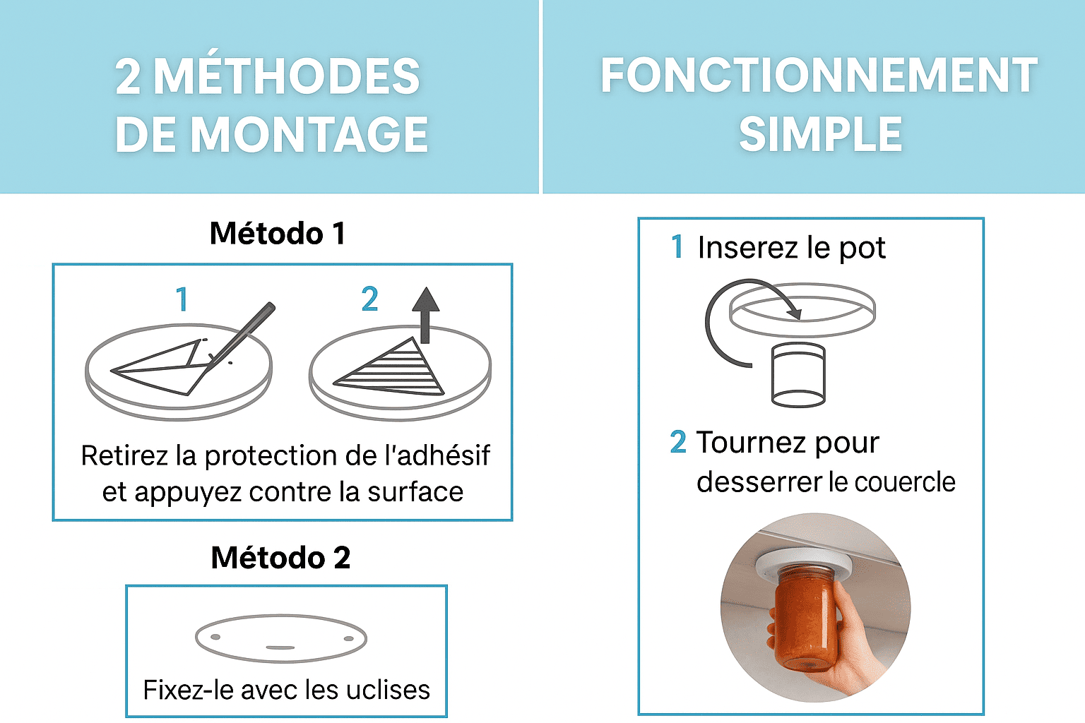 Installez-le rapidement avec de l’adhésif ou des vis, selon votre préférence. Une fois monté, il suffit d’insérer le bocal et de tourner – une solution sans tracas pour ouvrir les bocaux sans effort.